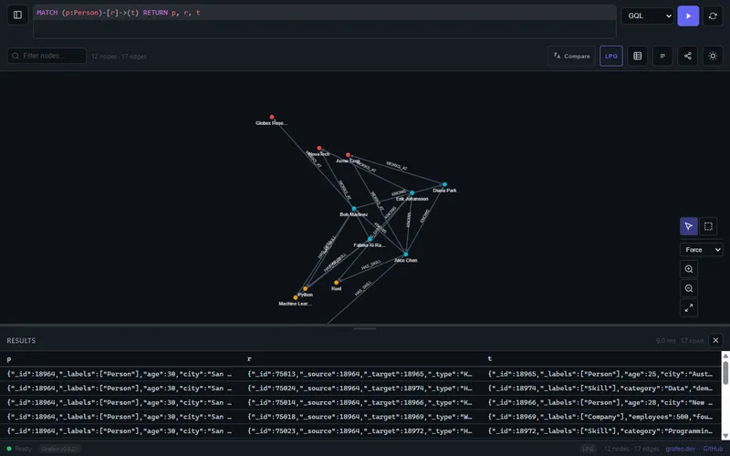 Grafeo is a high-performance graph database that ranks as the fastest tested on the LDBC Social Network Benchmark, featuring a lower memory footprint than other in-memory databases. It supports multiple query languages, including GQL, Cypher, Gremlin, GraphQL, SPARQL, and SQL/PGQ, and offers dual data model support for both Labeled Property Graphs (LPG) and RDF.