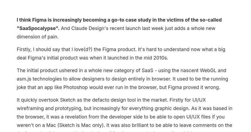 Figma is facing increasing challenges in the SaaS market, exacerbated by the recent launch of Claude Design. The introduction of Claude Design adds competitive pressure to Figma, which was once a leading product in the collaborative design space.